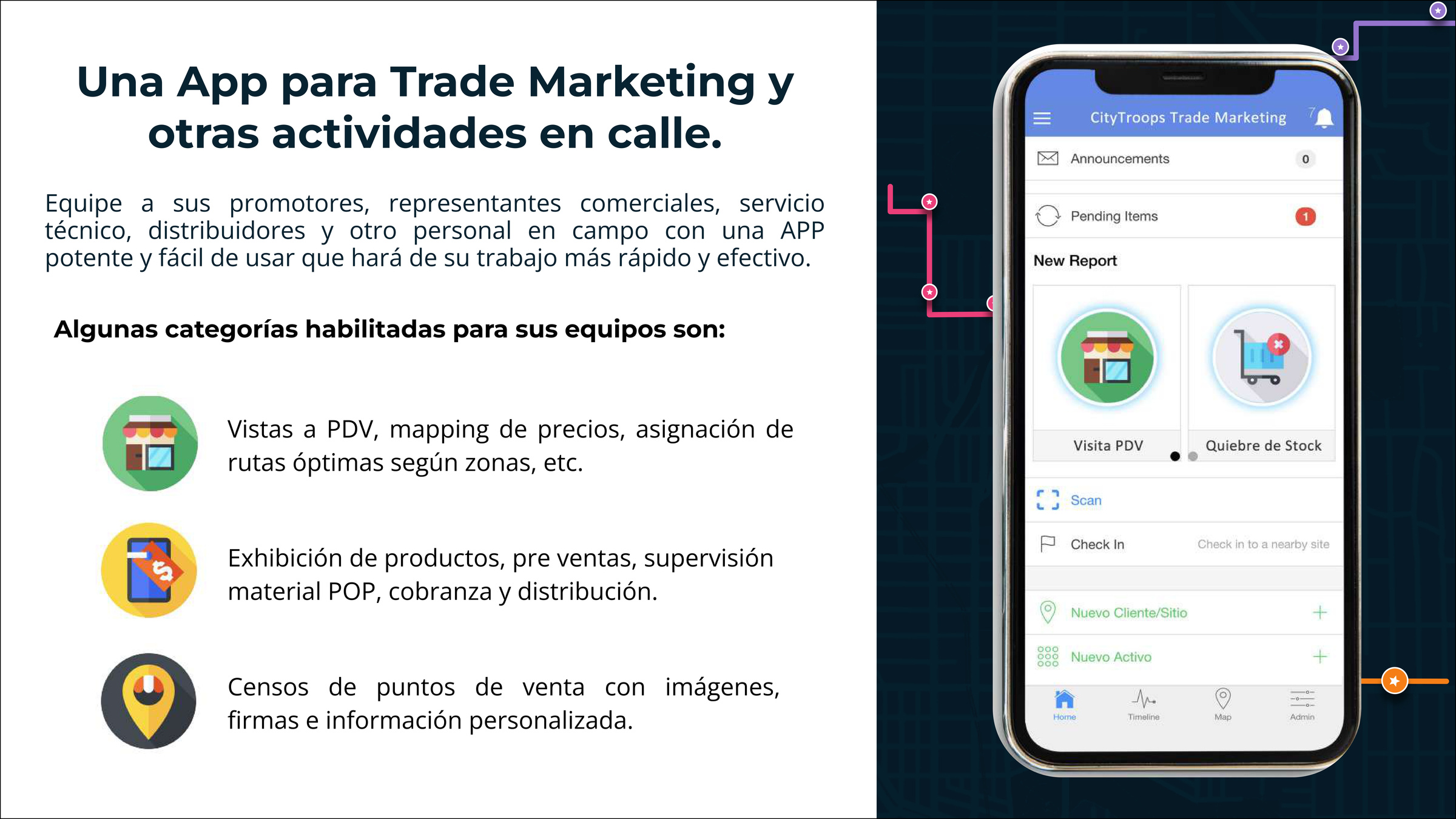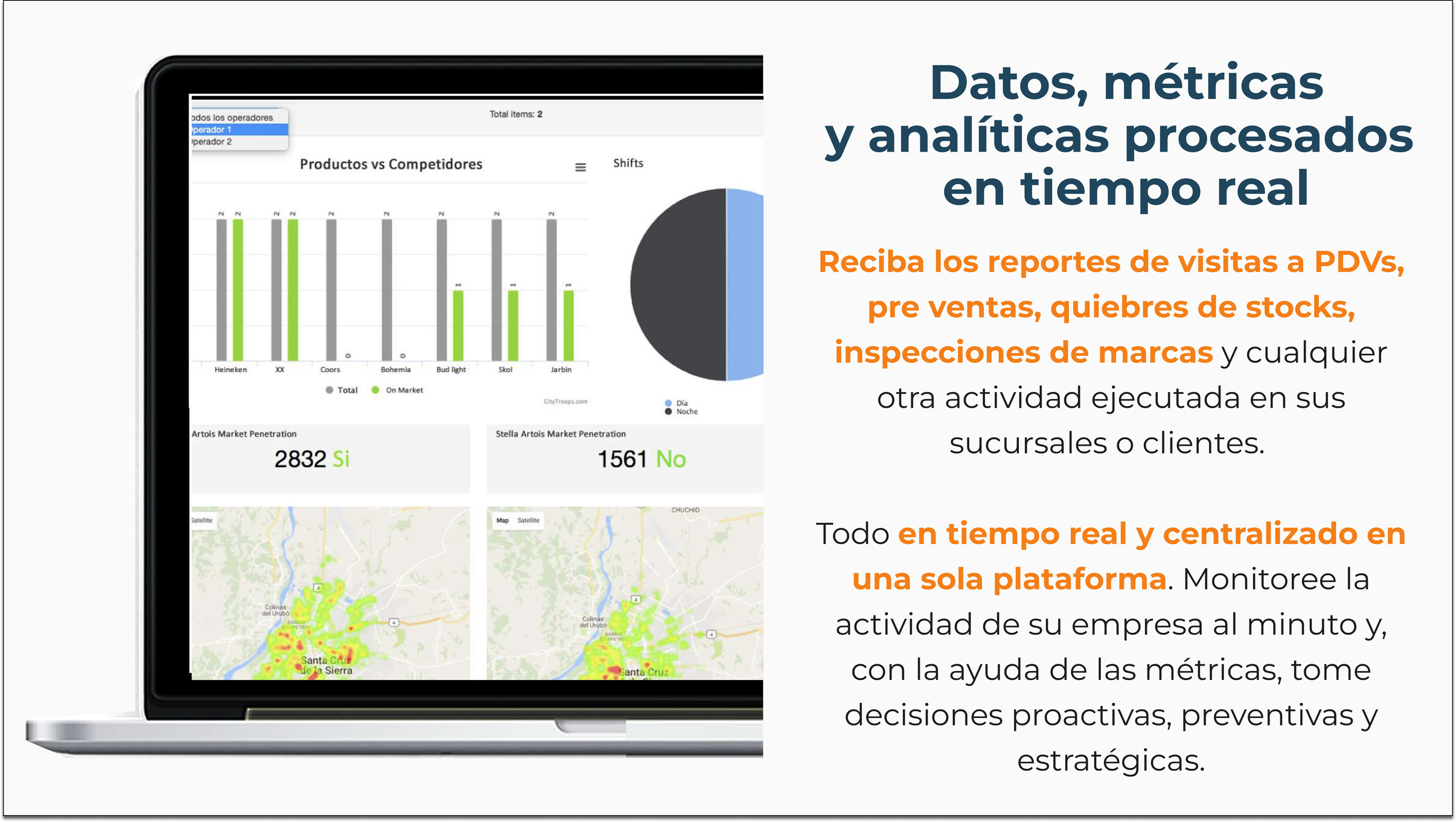 A través de la creación de rutas óptimas y el envío de informes en tiempo real sobre visitas a puntos de venta (PDVs), mapeo de precios, quiebres de stock y otras categorías, la empresa puede conocer instantáneamente el estado de sus operaciones y tomar decisiones estratégicas informadas.